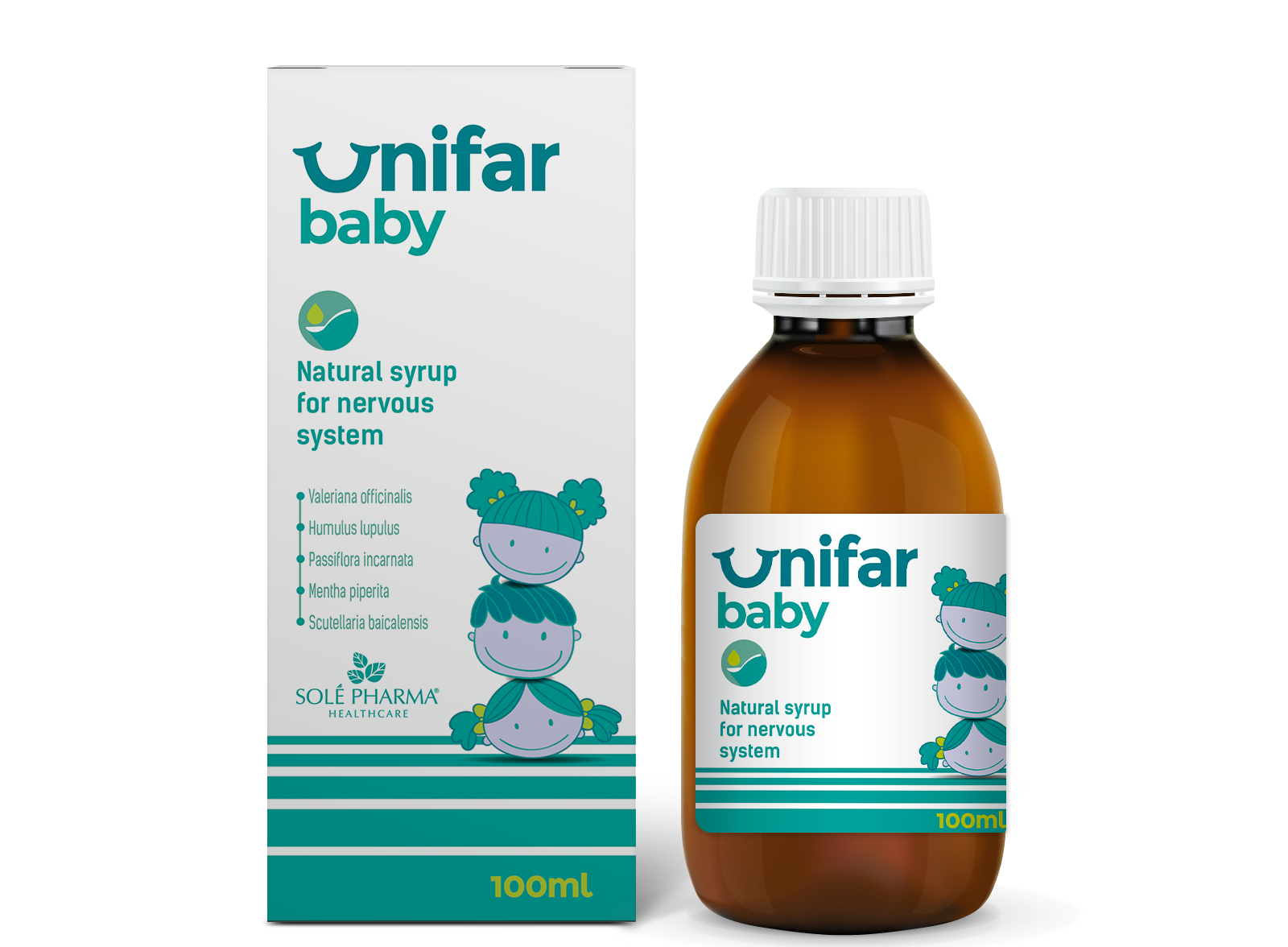 Unifar Baby is a natural product that is suitable for children at any age, especially during the period of growing, when the child’s nervous system is still developing and needs additional support, as well as during increased psycho-emotional stress and excitability. Unifar Baby contains extracts of valerian and hops, which provide a calming effect, support the activity of the central nervous system and help to improve the quality of sleep. Passion flower extract acts as a sedative, thereby promoting mental health. Peppermint leafs reduces tension in muscle tone and Skullcap extract alleviate mental and physical tension.