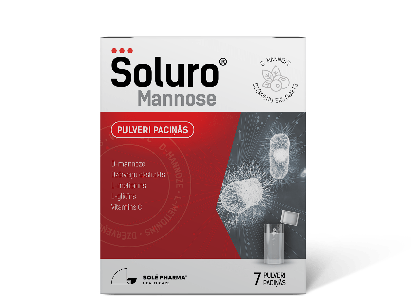 Soluro® Mannose satur augstas koncentrācijas D-mannozes, lielogu dzērveņu ekstrakta, aminoskābju un vitamīna kompleksu. Vitamīns C veicina normālu imūnsistēmas darbību. D-mannoze ir struktūrāli līdzīga uroepitēlija mannozilētiem receptoriem. Soluro® Mannose drīkst lietot kopā ar antibiotikām.