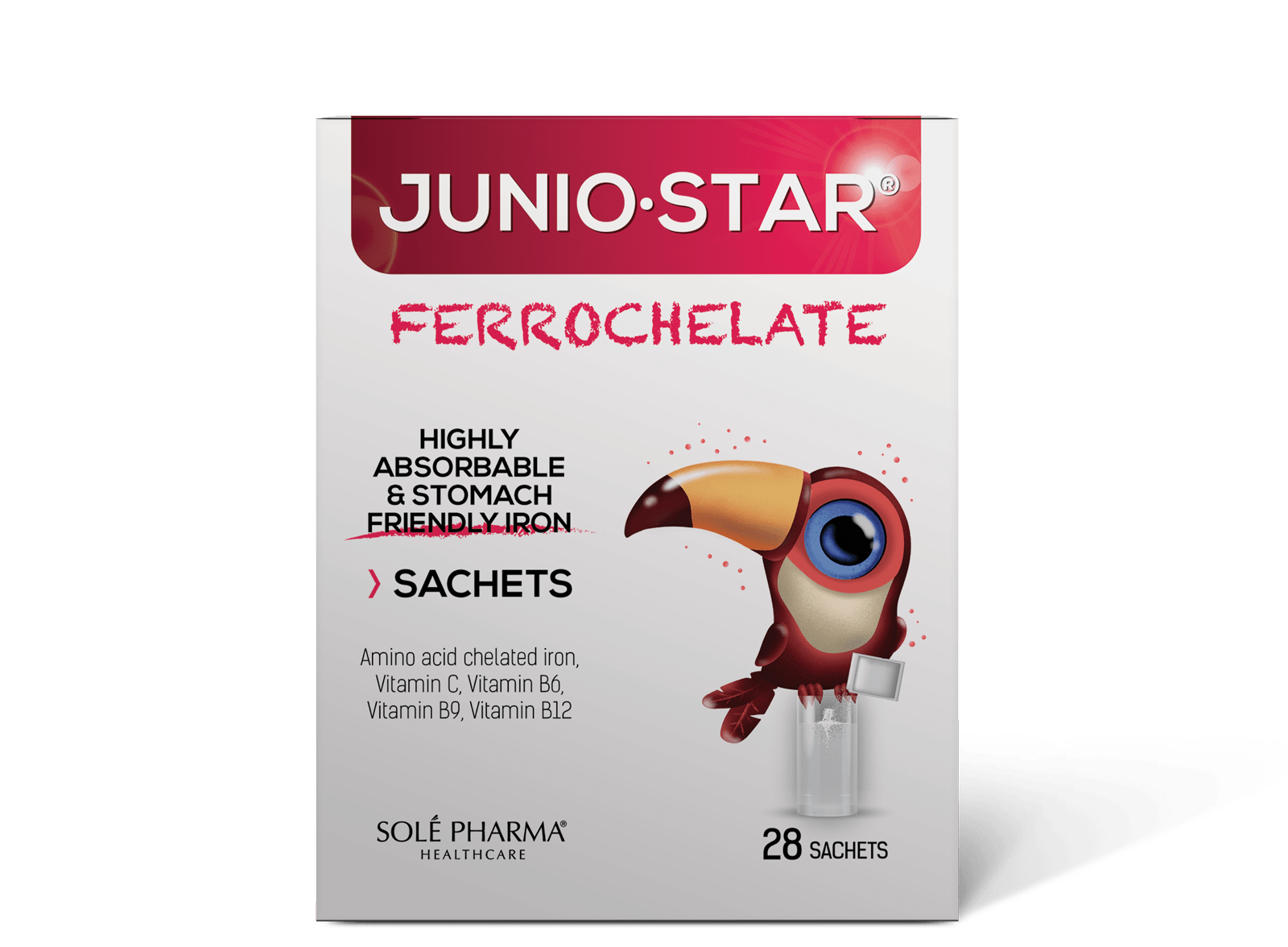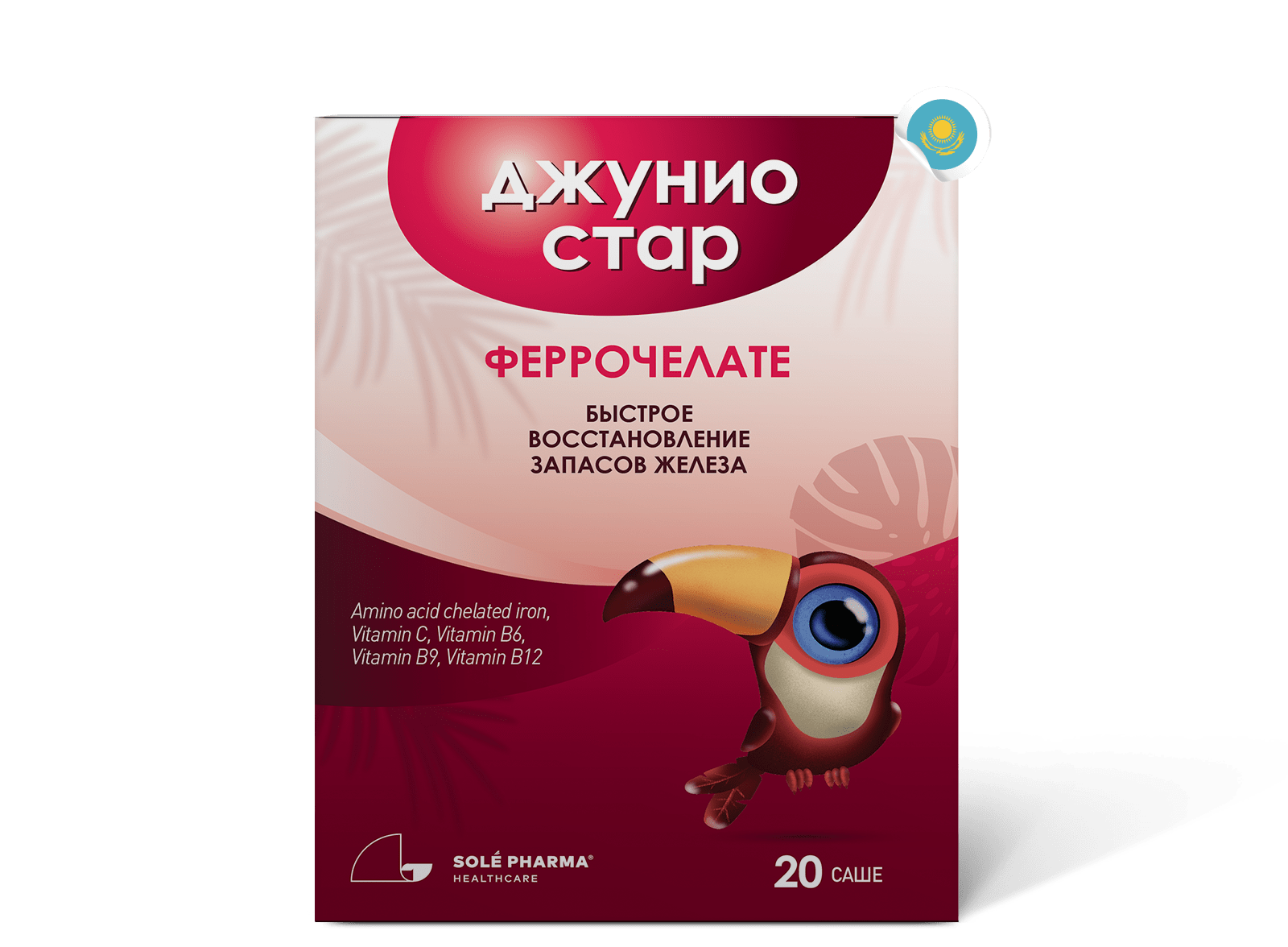 Junio·Star® Ferrochelate is a complex for children, who needs additional source of iron or in case of iron deficiency. Junio·Star® Ferrochelate highly bioavailable iron chelated form contributes to normal formation of red blood cells and haemoglobin without irritating the gastrointestinal tract, provides normal energy – yielding metabolism, that reduce fatigue and improves normal oxygen transport in the body. Vitamin C increases absorption of iron and together with other ingredients improves hemoglobin synthesis and alters tissue iron concetrations.